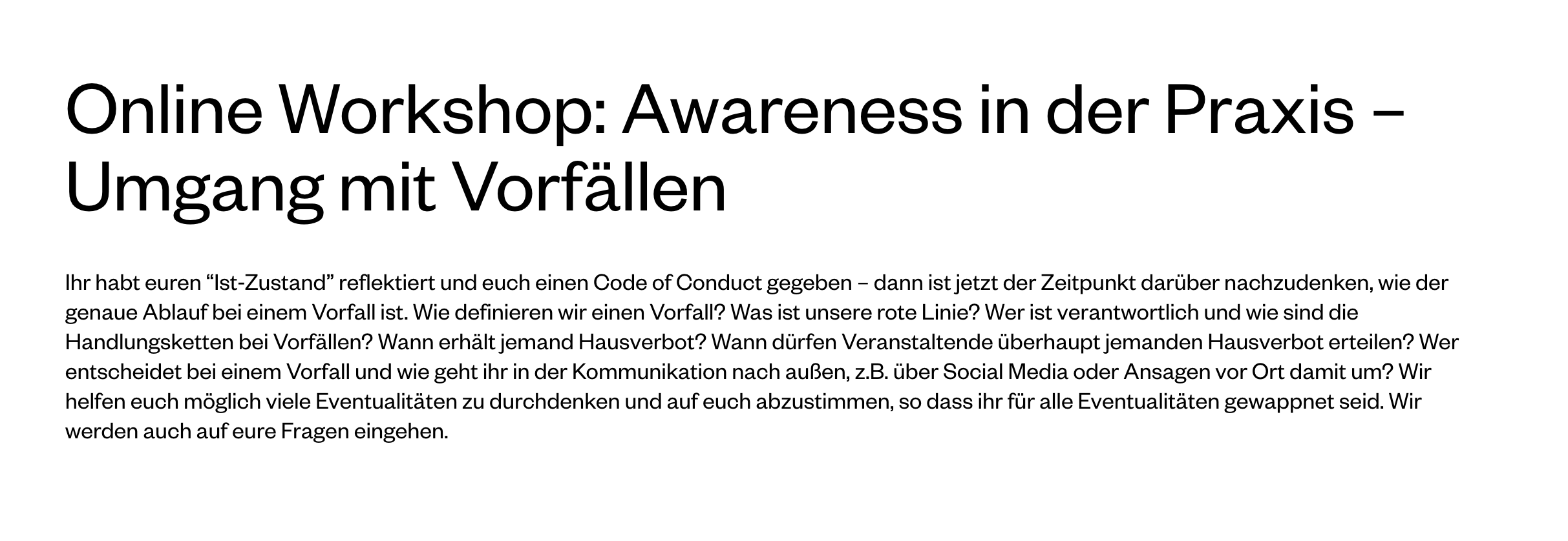 Ihr habt euren “Ist-Zustand” reflektiert und euch einen Code of Conduct gegeben – dann ist jetzt der Zeitpunkt darüber nachzudenken, wie der genaue Ablauf bei einem Vorfall ist. Wie definieren wir einen Vorfall? Was ist unsere rote Linie? Wer ist verantwortlich und wie sind die Handlungsketten bei Vorfällen? Wann erhält jemand Hausverbot? Wann dürfen Veranstaltende überhaupt jemanden Hausverbot erteilen? Wer entscheidet bei einem Vorfall und wie geht ihr in der Kommunikation nach außen, z.B. über Social Media oder Ansagen vor Ort damit um? Wir helfen euch möglich viele Eventualitäten zu durchdenken und auf euch abzustimmen, so dass ihr für alle Eventualitäten gewappnet seid. Wir werden auch auf eure Fragen eingehen.