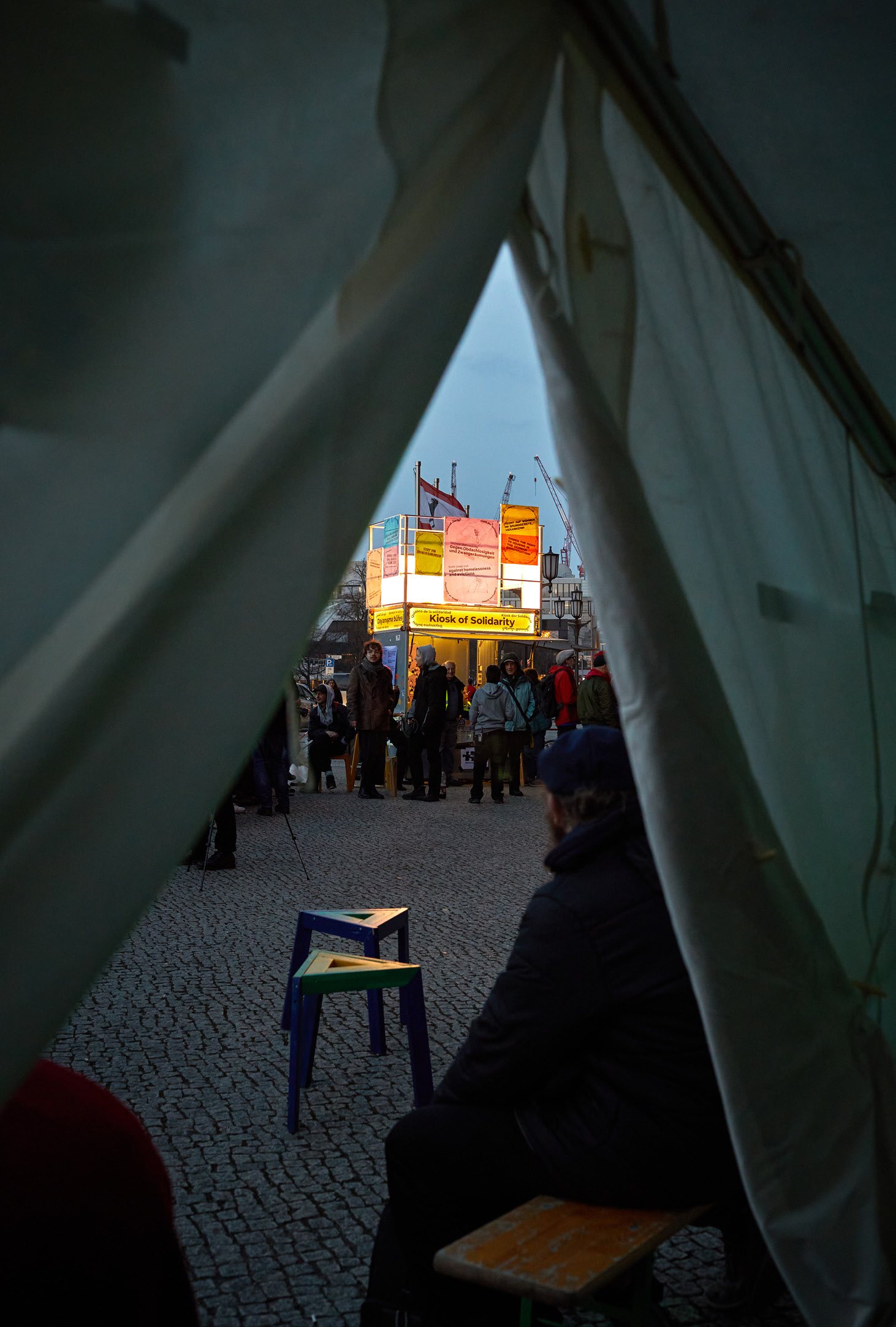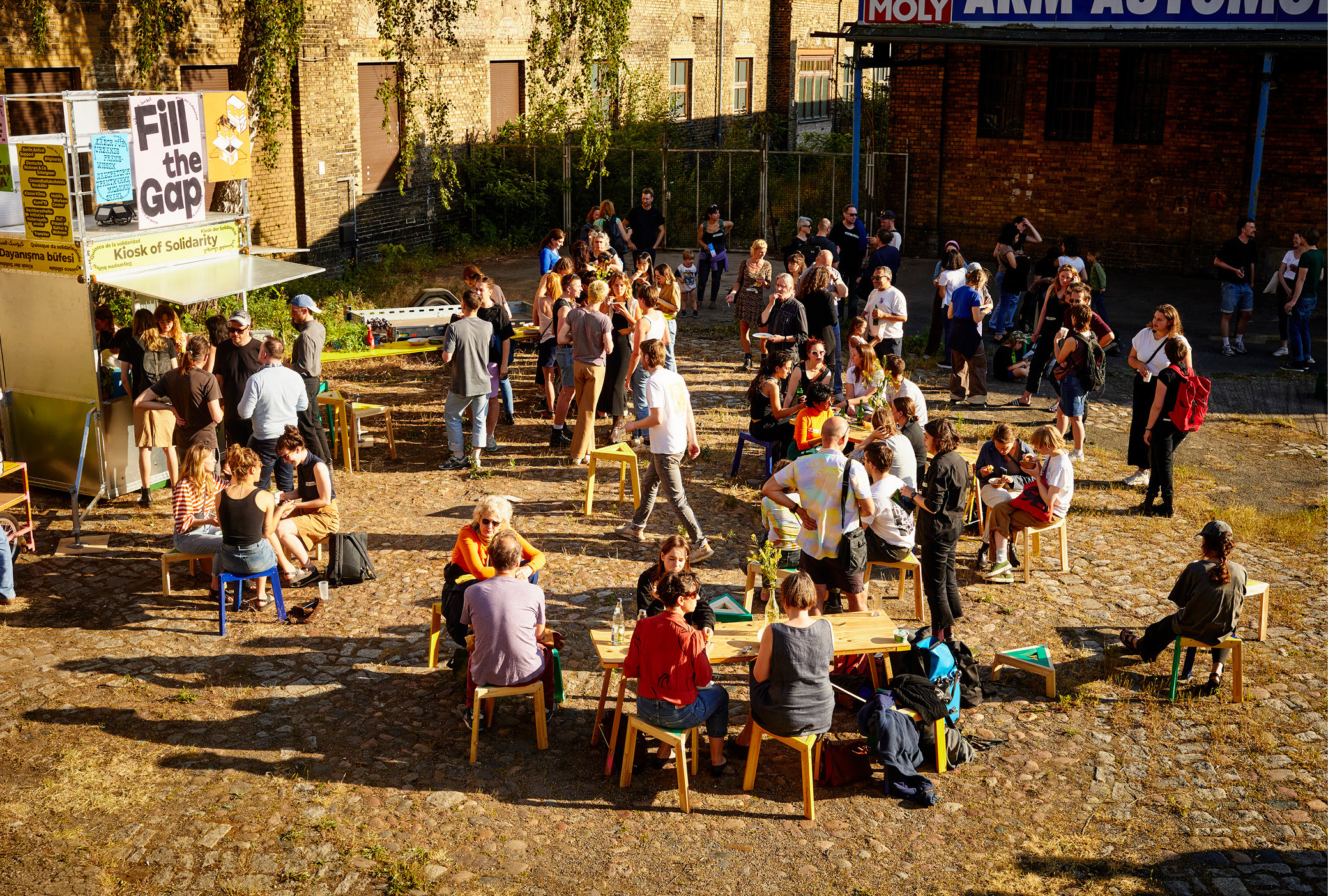 Der Kiosk der Solidarität ist ein urbanes Praxis-Format, das in die umkämpften gesellschaftlichen Felder Arbeit, Gesundheit und Wohnen in Berlin interveniert. Über 25 solidarische Berliner Initiativen und Projekte haben den Kiosk 2023-2024 an unterschiedlichen Orten Berlins jeweils für einige Tage genutzt. In vielfältigen Formaten bringen sie Nachbar*innen, Mitstreitende und andere Interessierte zusammen und tragen ihre solidarische Praxis temporär in den öffentlichen Stadtraum. Der Kiosk erzeugt für marginalisierte Gruppen (z.B. migrantische, geflüchtete, queere Communities oder wohnungslose Menschen) Sichtbarkeit und vernetzt diese mit anderen Initiativen. Das Kiosk-Projektteam unterstützt, zusammen mit Studierenden der TU Berlin, die Initiativen bei der Realisierung ihrer Nutzungsideen für den Kiosk: bei der Gestaltung der Poster, der Beantragung der Standgenehmigungen, der Logistik, der Dokumentation und der Finanzierung.