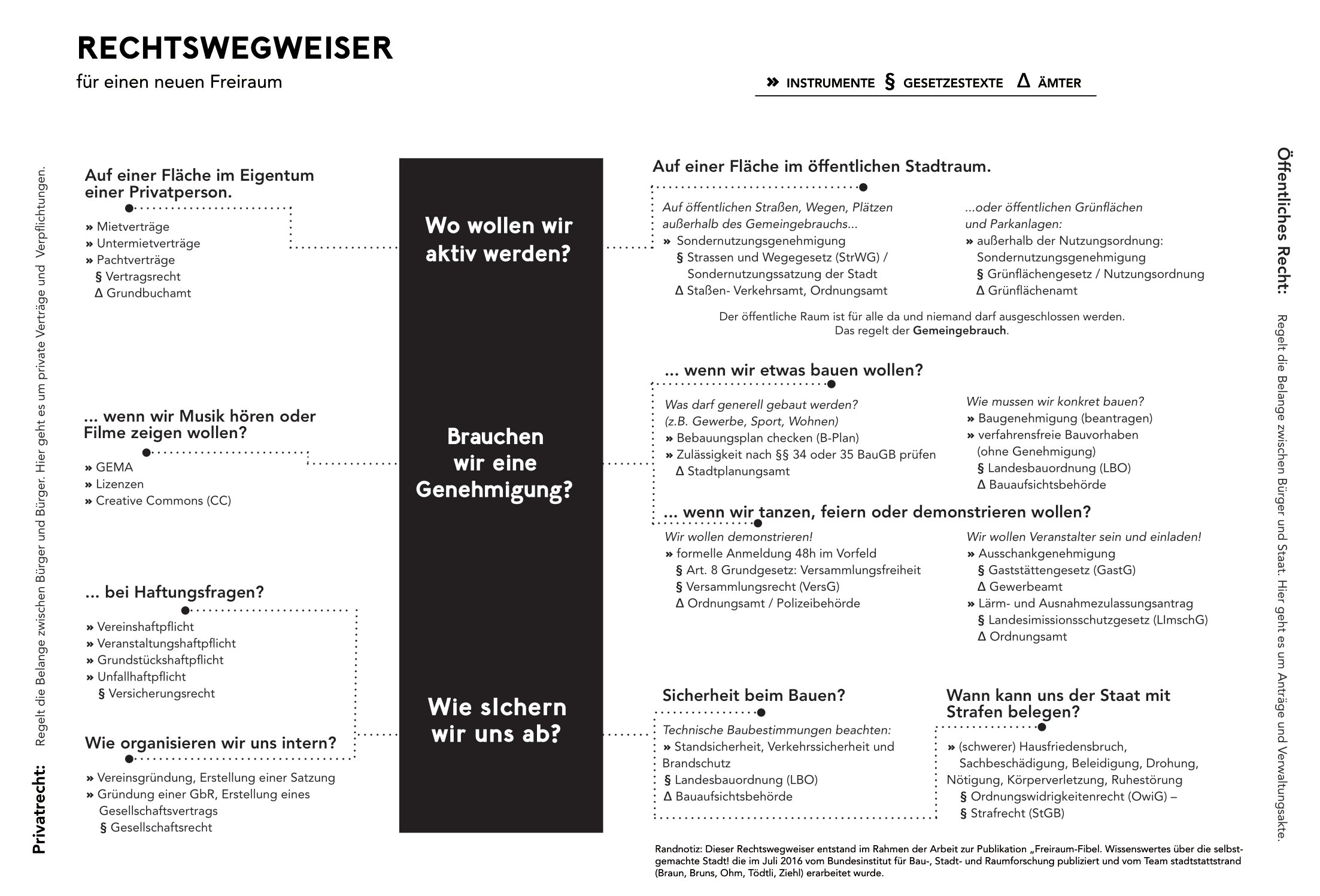 Der Rechtswegweiser für einen neuen Freiraum liefert einen ersten Überblick über relevante Gesetze, Instrumente und zuständigen Ämter für euer Freiraumprojekt.