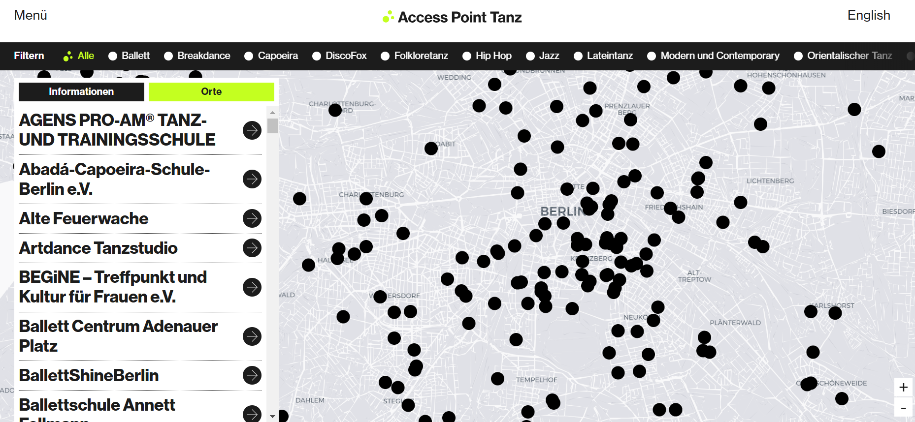 Diese Kartierung zielt darauf ab, das Spektrum und die Breite von Tanzangeboten in ganz Berlin aufzuzeigen. Ob in Tanzschulen, Nachbarschaftszentren,