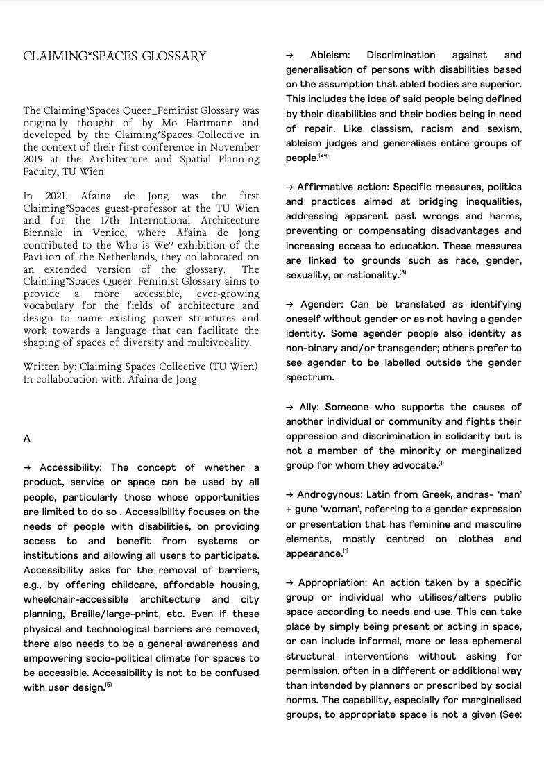 The ClaimingSpaces Queer_Feminist Glossary was originally thought of by Mo Hartmann and developed by the ClaimingSpaces Collective in the context